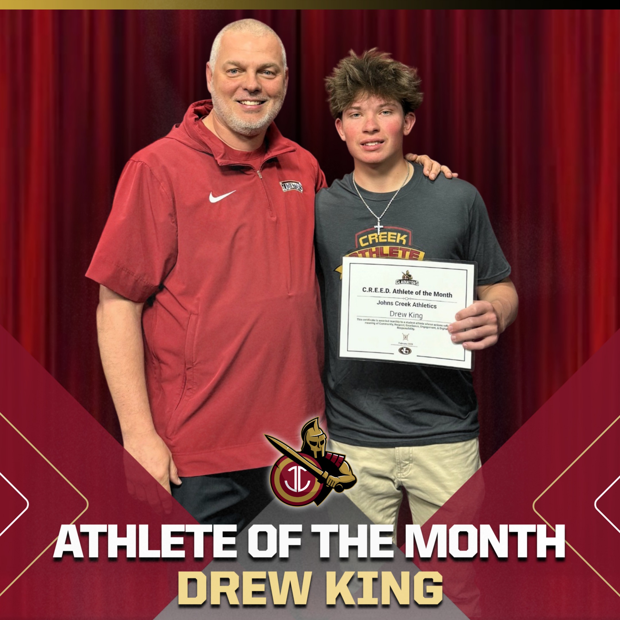 Drew King embodies everything we hope to see in a Johns Creek athlete: talent, humility, leadership, positivity, and a genuine love for the game—and for his school. His impact reaches teammates, coaches, teachers, and peers, making him a deserving recipient of our February Athlete of the Month honor.